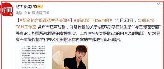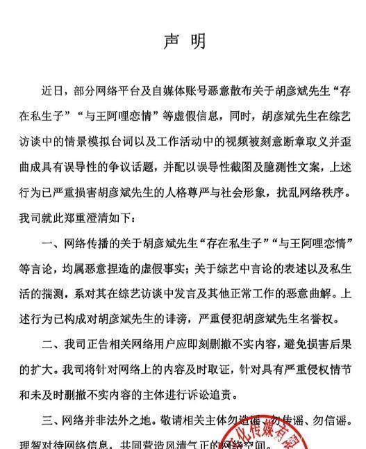 声明中说,关于“与王阿哩恋情”、“有私生子”等传闻都是虚假消息,是对其私生活的曲解,希望大家能停止造谣。胡彦斌还在声明中要求造谣者删除不实内容,不然他将收集证据,用法律的武器来保护自己。